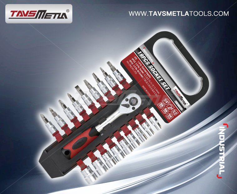 19PCS 1/4"Dr. Socket Set NO.:TM-M0119 Clicks : 108 · 1PC 1/4"Dr. Ratchet Handle; · 9PCS 1/4"Dr. Socket : 6,7,8,9,10,11,12,13,14mm; · 9PCS 1/4"Dr. Bit Socket : T30,SL4,SL5.5,SL6.5,SL7, PH1,PH2,PZ1,PZ2. NO. SIZE QTY./CARTON TM-M0119 1/4" Dr. 5/20